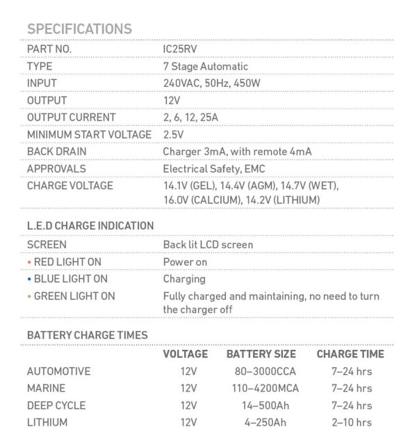 The ideal charger for direct RV fitment. Delivering a sophisticated charge and multichemistry profile selection, this ultra robust 25A unit is engineered to handle the rigours of on and off-road in-vehicle permanent installation. Comes with a 5 year warranty. Remote included.